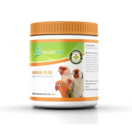 Inmume Plus Avianvet es un complemento alimenticio en polvo que contiene antioxidantes naturales como la vitamina C, polifenoles cítricos y flavonoides que ayudan a desarrollar el sistema inmunológico de los canarios a nivel digestivo, Inmume Plus Avianvet mejora la asimilación de los nutrientes y la digestibilidad de la comida.
