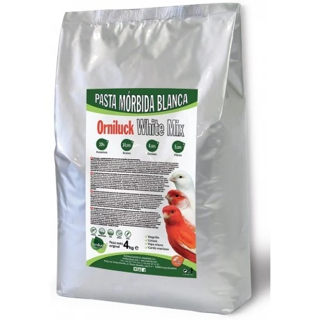 Orniluck White Mix Pasta Profesional sin dore con semillas Negrillo, Linaza, Pipa micro, cardo mariano. Fórmula nutritiva y altamente equilibrada, Contiene todos los nutrientes esenciales para la primera fase de la vida de las aves, con vitaminas, proteínas, extractos de vegetales y aminoácidos, Es muy apetitoso y alta en proteínas. Recomendada en época de Muda/Preparación/Cría