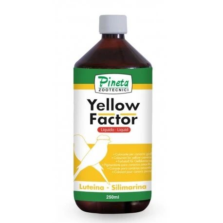 YELLOW FACTOR LIQUIDO es un pigmentante natural específico para canarios de factor amarillo a base de luteína, aporta mayor intensidad de lipocromo amarillo del plumaje y también mejora el brillo de la pluma. Contiene también extractos secos de silimarina (cardo mariano), diente de león y equinácea que ayuda a mejorar las funciones Hepático y Desintoxicante. Ideal también para canarios de postura amarillos (Norwich, Yorkshire, Gloster, ecc.) y exóticos (diamantes de Gould, diamantes mandarines, etc.).